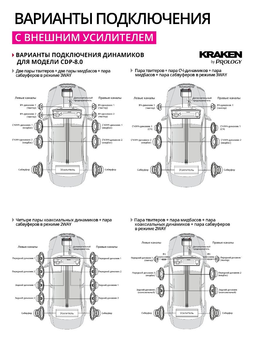 Схемы возможных подключений акустических систем и сабвуферов для магнитол KRAKEN серии CDP с DSP процессорами: Смотреть