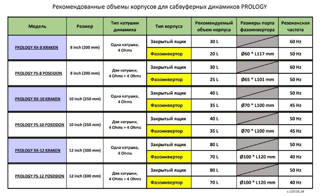 Таблица с рекомендованными объёмами корпусов для сабвуферных динамиков PROLOGY